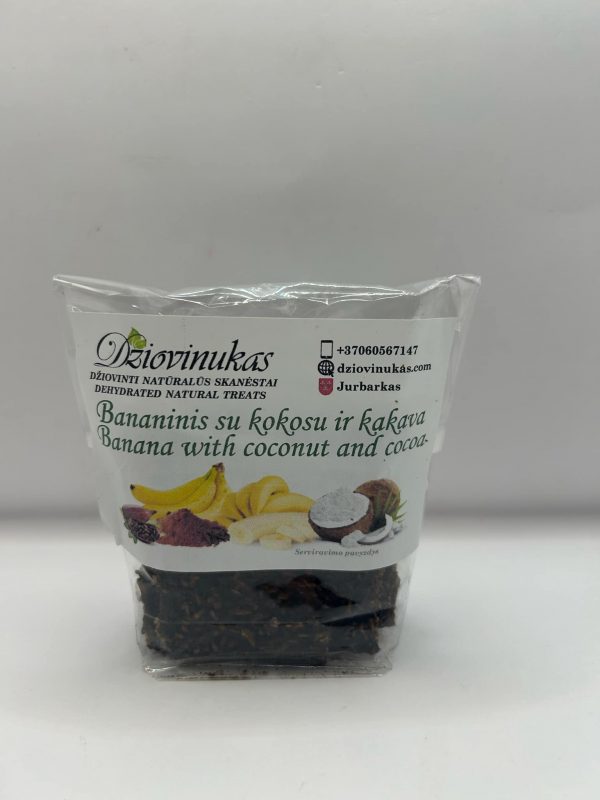 SUDEDAMOSIOS DALYS: bananai (82%), kokoso riešuto drožlės (16%), kakavos milteliai (2%).